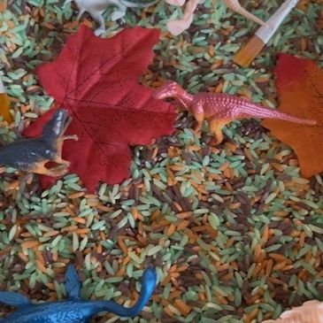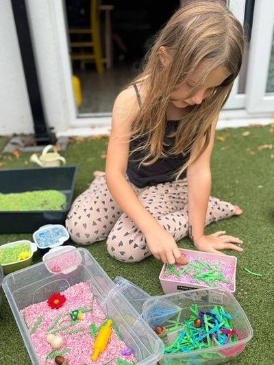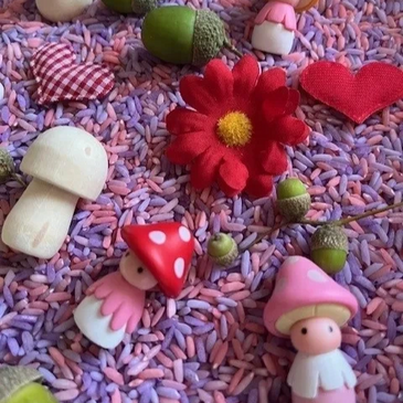 · Different colours stimulate - creativity, imagination and the ability to share ideas. It encourages imaginative and open-ended play. Children can use the rice as a base for imaginative scenarios, pretend cooking, construction, and small-world play, fostering creativity and storytelling skills.