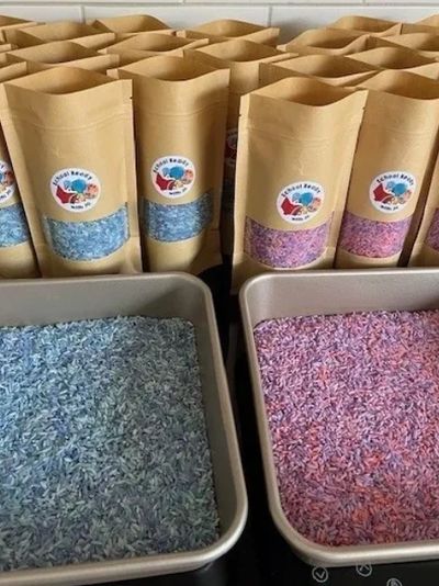 The 600g coloured rice packs come in all different colours and colour mixes. They also come with a beautiful wooden scoop or tweezer. £5